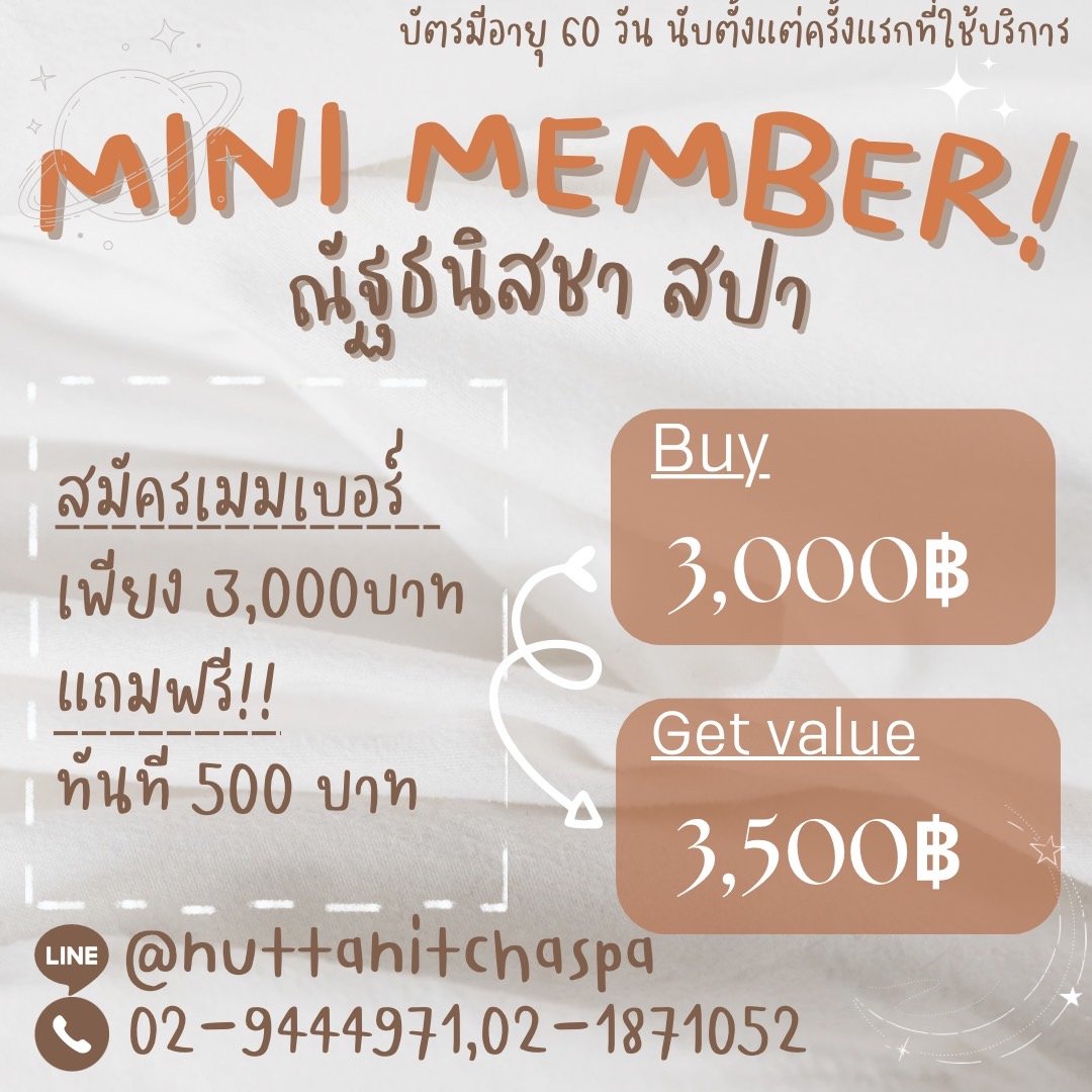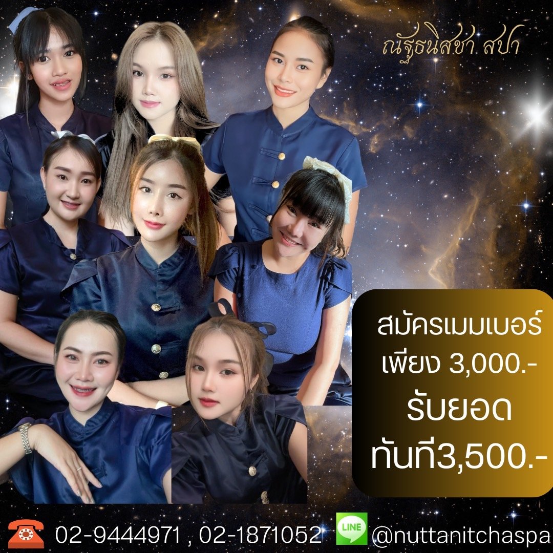 ณัฐธนิสชา สปา 👉น้องๆน่ารัก ใจใส่ทุกขั้นตอนการให้บริการ 👉สถานที่สะอาด ทั้งภายในห้องและบริเวณร้าน 👉บรรยากาศเงียบ เป็นส่วนตัว 👉ได้หลายความรู้สึก relax-สบายตัว-คลายเมื่อย ราคาเริ่มต้นเพียง350 บาทเท่านั้น โทรสอบถาม ☎️ 02-1871052, 02-9444971 Id line: @nuttanitchaspa 📍นวลจันทร์,รามอินทรา40